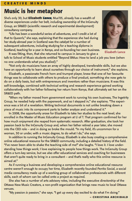 Elizabeth has sat on the boards of multiple organizations, including the Ottawa International Jazz Festival, the Ottawa Chamber Orchestra, and the Ottawa New Music Creators.